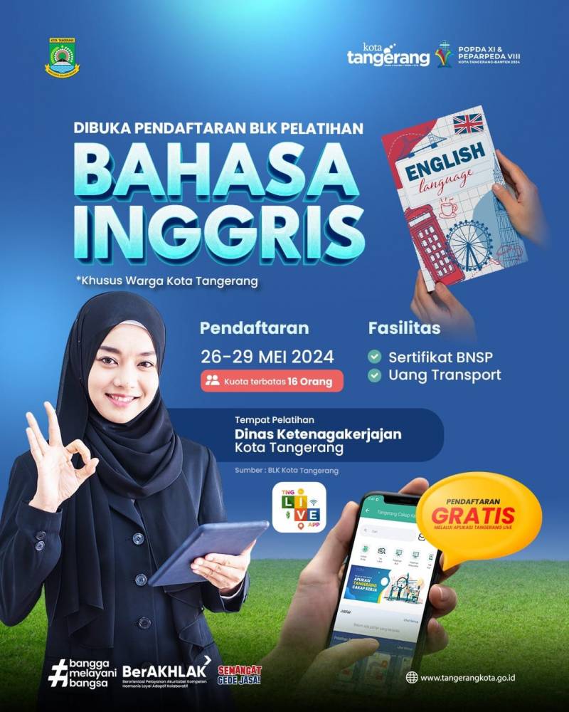 Dinas Ketenagakerjaan (Disnaker) Kota Tangerang melalui Balai Latihan Kerja (BLK) mengumumkan pembukaan pendaftaran untuk pelatihan bahasa Inggris secara gratis. Pendaftaran ini berlangsung dari 26 hingga 29 Mei 2024.