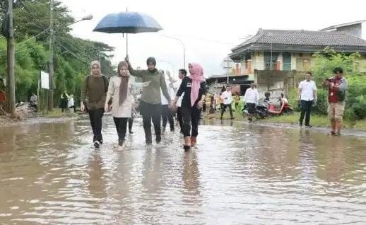 Bupati Kabupaten Serang, Ratu Rachmatuzakiyah bersama rombongan tinjau lokasi terdampak banjir di Kampung Mekarsari, Desa Margasari kecamatan Pulo Ampel Kabupaten Serang, Rabu (18/6/2025).