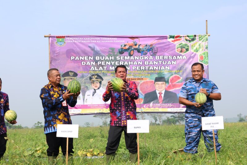 Bupati Tangerang, Moch Maesyal Rasyid melakukan panen semangka bersama dan menyerahkan Alat Mesin Pertanian (Alsintan) untuk Kelompok Tani Buaran Asem Desa Tanjung Asem Kecamatan Mauk, Kamis (03/7/25).