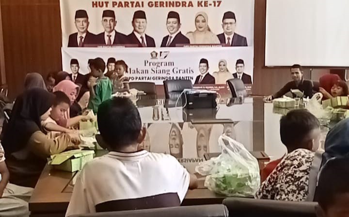 Kantor DPD Gerindra Provinsi Banten di Jl. Raya Serang-Pandeglang Tembong, Cipocok Jaya Kota Serang, Banten diduduki ratusan warga yang menikmati makan siang gratis setiap hari.