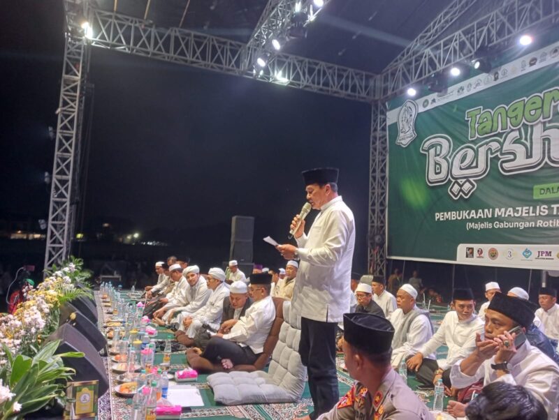 Gubernur Banten Andra Soni dan Bupati Tangerang Moch Maesyal Rasyid mengikuti acara Tangerang Raya Bersalawat dalam rangka pembukaan Majelis Talim dan Zikir Nurul Habib, di Stadion Mini Kecamatan Rajeg, Kabupaten Tangerang, Minggu (25/5/2025), malam.