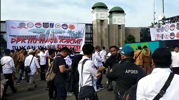 Massa yang tergabung dalam Asosiasi Pemerintah Desa Seluruh Indonesia (Apdesi) melakukan blokade di ruas Tol Dalam Kota yang berada di depan Gedung MPR/DPR, Senayan, Jakarta. Informasi blokade tol diunggah melalui akun media sosial kepolisian pada Rabu (31/1).
