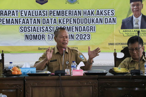 Pemerintah Kabupaten (Pemkab) Serang melalui Dinas Kependudukan dan Pencatatan Sipil (Disdukcapil) menggelar Rapat evaluasi pemberian hak akses pemanfaatan data kependudukan dan Sosialisasi Permendagri Nomor 17 Tahun 2023. Sasaran evaluasi bagi Organisasi Perangkat Daerah (OPD) Kabupaten Serang yang mendapatkan hak akses pemanfaatan data kependudukan.