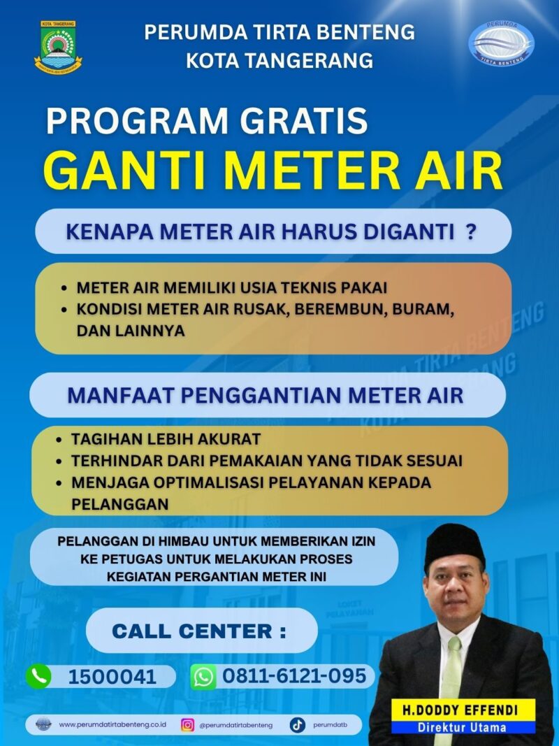 Kami menghimbau kepada pelanggan yang memiliki Meter Air berusia tua, buram, berembun dan mengalami kerusakan lainnya untuk segera menghubungi Call center 1500041, 0811-6121-095 (Whatsapp) dan media sosial Instagram @perumdatirtabenteng.