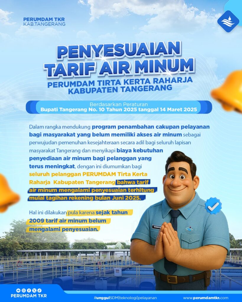 Perusahaan Umum Daerah Air Minum Tirta Kerta Raharja (PERUMDAM TKR) Kabupaten Tangerang mengumumkan penyesuaian tarif air minum sebagai bagian dari kebijakan strategis untuk memastikan keberlanjutan pelayanan dan pemerataan akses air bersih.
