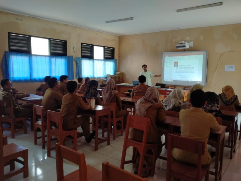Salah satu wali kelas IX A SMPN 1 Bandung, Romdhana Syufi sedang melaksanakan Penelitian Tindakan Kelas (PTK ) dan Best pratice tahun 2023 di hadapan guru di salah ruangan sekolah, Senin (4/12/23).