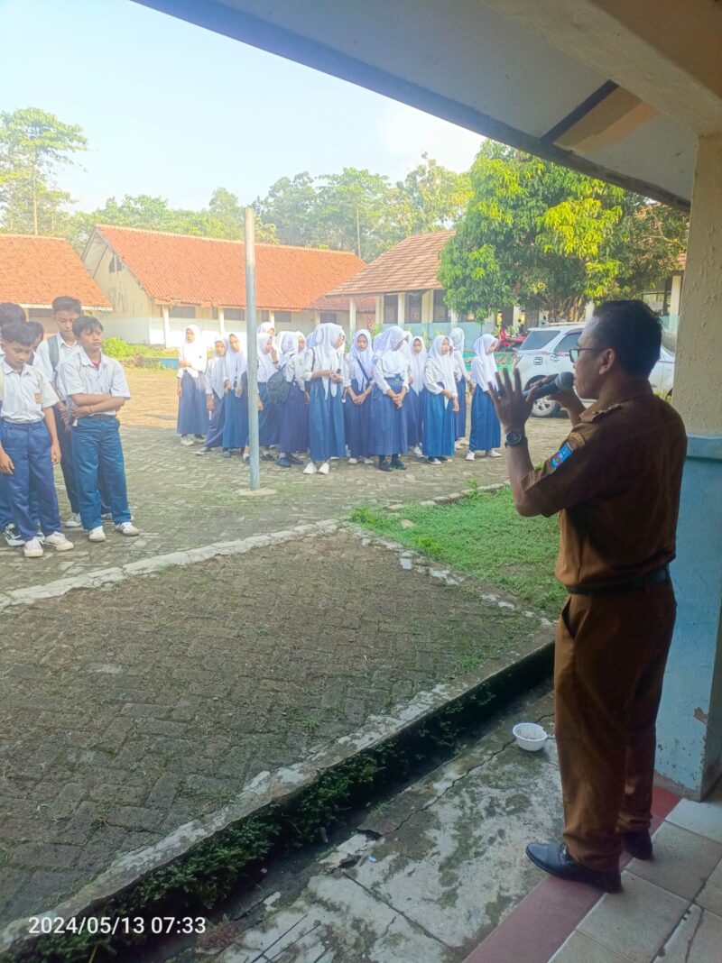Kepala UPT SMPN 3 Pamarayan memberikan pengarahan dan motivasi kepada peserta didik kelas IX yang akan menjalani Ujian Sekolah (US) tahun pelajaran 2023-2024 di halaman sekolah, Senin (13/5/24).